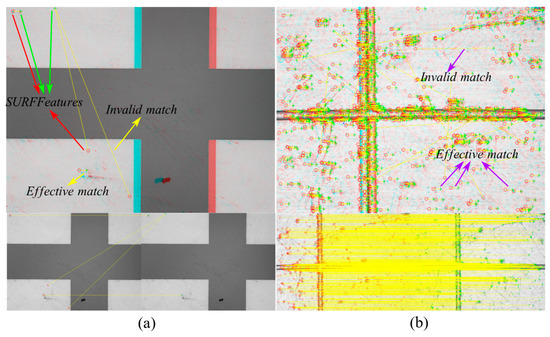 Figure 9 shows the feature-matching results obtained by using the SURF algorithm on the images captured before and after moving the etched morphology and ultra-precision machining microstructure by 30 μm, respectively. The extracted feature points and matching results are displayed, where the red circles represent the feature points in the image before translation, the green crosses represent the feature points in the image after translation, and the yellow lines represent the matching results. Figure 9a shows the matching result of the etched morphology, and Figure 8 and Figure 9 show the matching result of the ultra-precision machining microstructure.