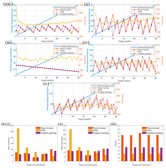Results of calculating the absolute displacement of ultra−precision machining microstructure unidirectional movement using phase correlation method, template−matching method, and SURF feature extraction. (a) Measurement errors at different single displacements: (i) single displacement of 1 μm; (ii) single displacement of 2 μm; (iii) single displacement of 3 μm; (iv) single displacement of 4 μm; (v) single displacement of 5 μm. (b) Statistical results at different single displacements: (i) maximum measurement error; (ii) average measurement error; (iii) measurement time.