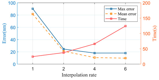 The results show that both the average and maximum measurement errors decrease with increasing interpolation factor, and after 6× interpolation, the average and maximum measurement errors are less than 20 nm. When the interpolation factor is greater than 2×, the decrease in measurement error becomes less significant, which is due to overfitting caused by a too-high interpolation factor, leading to new errors. As the interpolation factor increases, the measurement time increases rapidly due to the sharp increase in computational amount, so it is not advisable to choose a large interpolation factor. When the interpolation factor is 4×, the measurement time is less than 70 s, the average measurement error is less than 15 nm, the maximum measurement error is less than 20 nm, and the repeatability is approximately 54 nm, which can achieve fast and high-precision measurement.