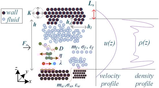 Molecular dynamics model, with all parameters involved in flows between two infinite plates, as shown in Table 1 and Table 2. The mechanisms of diffusion, D, viscosity, , thermal conductivity, , and the slip length, , are abstractly presented, along with a characteristic velocity and density profile at the nanoscale.