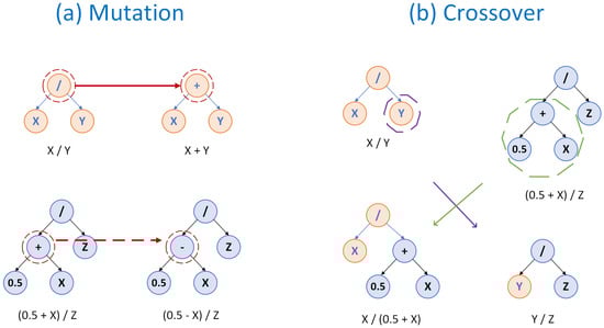 The processes of (a) mutation and (b) crossover in genetic programming, shown in a tree structure form. In mutation, new equation nodes or branches can substitute less accurate ones, while in crossover, branches can be swapped between different trees.