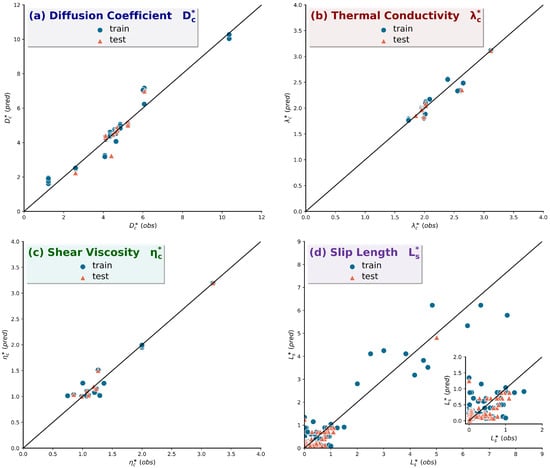 From a statistical point of view, transport property expressions achieve fine accuracy. This is further supported by minor residual errors observed in the respective identity plots (Figure 3). On the contrary, slip length accuracy measures are smaller. A point worth mentioning is the fact that training and testing accuracy values are balanced, and this is evidence of the absence of over-fitting. In other words, the SR algorithm trained on the available data may be incorporated for predictions outside (extrapolation) and between (interpolation) the available data points, making this framework both transparent and generalizable.