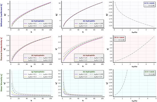 Another important remark is that shear viscosity from the SR-derived Equation (14) for both hydrophobic and hydrophilic channels, shown in Figure 4g,h, respectively, clearly obtains its bulk value for . This is in fine agreement with our previous numerical investigation in []. Larger values are obtained for hydrophilic walls, and this is also shown in Figure 4i, for the case of . Furthermore, thermal conductivity SR Equation (13) reveals a increase vs. and h, in Figure 4d,e. Higher values refer to more hydrophilic walls. It is worth noting that thermal conductivity inside narrow channels, i.e., for , increases as the walls become more hydrophilic (Figure 4f).