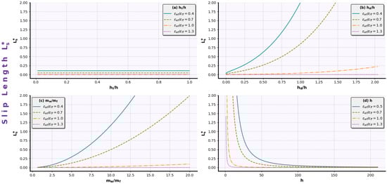Slip length equation dynamics for various vs. (a) , (b) , (c) , and (d) h.