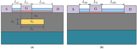 The details of key structural parameters of the PBL GaN HEMT and Cov GaN HEMT are summarized in Table 1. As shown in Figure 1a, the left side of the PBL is aligned with the left side of the gate. LP is the length of the PBL, TP is the thickness of the PBL, and the DP represents the spacing between the PBL and the bottom of the AlGaN barrier layer. Furthermore, when using Mg as a P-type dopant, the activation rate is very low due to Mg being a deep-level impurity. Therefore, the hole concentration in the P-type GaN buried layer is unlikely to exceed 1 × 1018 cm−3 [19] Considering that the simulation should be consistent with reality, NP is the doping concentration of PBL, and the value is set between 1 × 1017 cm−3 and 5 × 1017 cm−3 [20].