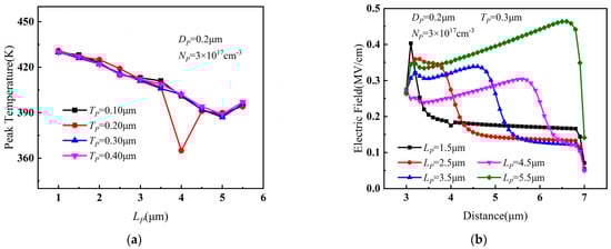 The relationship of the peak temperature of PBL GaN HEMTs with LP and TP is presented in Figure 4a. It can be observed that, as LP gradually increased, the peak temperature decreased significantly. However, when LP continued to increase further, the peak temperature no longer decreased but slightly increased. The variation of channel electric field between gate and drain with LP is shown in Figure 4b. With the increase in LP, the depletion effect of PBL on 2DEG was enhanced, leading to a weakening of the channel electric field between the gate and drain, and a reduction in the maximum temperature. However, when LP became larger, the distance between PBL and the drain decreased, resulting in a sharp increase in the electric field between the right side of PBL and the drain. Therefore, the peak temperature increased marginally.