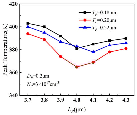 From Figure 4a, it can also be seen that the peak temperature showed only minor variations with different values of TP. However, when TP = 0.2 μm and LP = 4 μm, there was a noteworthy decrease in the device temperature, indicating that the change in TP had a noticeable impact on the device temperature only when LP took a specific value. Therefore, a simulation was performed with smaller incremental steps in parameter values near TP = 0.2 μm and LP = 4 μm, and the results are shown in Figure 5. As in Figure 4a, the results in Figure 5 also prove that the device temperature was lowest when TP = 0.2 μm and LP = 4 μm. Considering the combined effects of LP and TP on the device temperature, the optimal value for the length LP of PBL was determined to be 4 μm, and the optimal value for the thickness TP was determined to be 0.2 μm.
