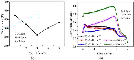 Figure 6a shows the relationship between the peak temperature of PBL GaN HEMT and the doping concentration NP of PBL when TP = 0.2 μm, DP = 0.2 μm, and LP = 4 μm. As NP increased, the peak temperature decreased greatly. However, after NP exceeded 3 × 1017 cm−3, the peak temperature no longer continued to decrease but rather increased noticeably. The relationship of the channel electric field between the gate and drain with NP is shown in Figure 6b. The electric field initially decreased and then increased with the increase in NP. Furthermore, when NP exceeded 3 × 1017 cm−3, the electric field sharply increased, resulting in an obvious increase in the peak temperature instead. Considering the variations of device temperature and channel electric field between gate and drain with respect to NP, the optimal doping concentration of PBL was chosen to be 3 × 1017 cm−3.