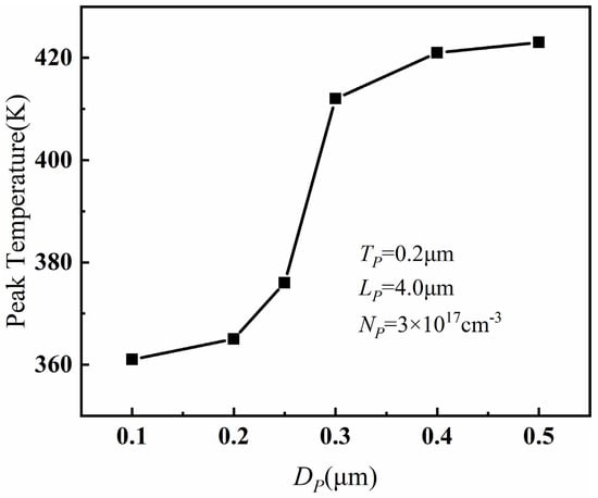 The relationship between the peak temperature and DP when TP = 0.2 μm, LP = 4 μm, and NP = 3 × 1017 cm−3.