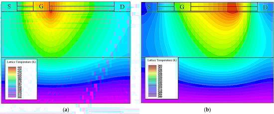 On the basis of the previous simulation results, the optimal structural parameters for PBL were set as LP = 4 μm, DP = 0.2 μm, NP = 3 × 1017 cm−3, and TP = 0.2 μm. Then, temperature simulations were performed for both PBL GaN HEMT and Cov GaN HEMT.