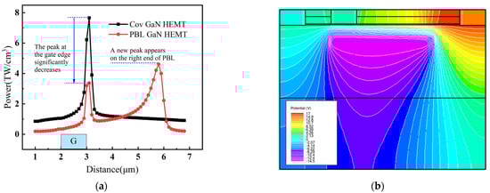 The heat power in the channel of Cov GaN HEMT and PBL GaN HEMT is shown in Figure 10a. It can be observed that the variation of the channel electric field in PBL GaN HEMT led to a substantial change in the distribution of heat power. The peak heat power at the gate edge decreased, and a new peak was generated at the right end of the PBL, resulting in a more uniform distribution. Therefore, the channel temperature of PBL GaN HEMT in Figure 9a was lower than that of Cov GaN HEMT and exhibited a more uniform distribution. The new peak of heat power at the right end of PBL in Figure 10a was higher than the peak at the gate edge, indicating that the electric field peak at the right end of PBL in Figure 9b played a dominant role in the self-heating effect, resulting in a significant rightward shift of the channel temperature peak in Figure 9a for PBL GaN HEMT. Furthermore, although it can be seen from Figure 9 that the peak electric field magnitude at the gate edge was very close to the peak electric field at the right end of the PBL, it is evident from the equipotential lines in Figure 10b that the equipotential lines near the right end of the PBL were much denser than those at the gate terminal. This indicates that the electric field near the right end of the PBL was larger and more concentrated, resulting in a higher heat power compared to the gate edge.