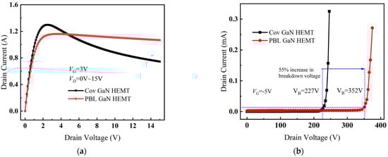 (a) The output characteristic curves for Cov GaN HEMT and PBL GaN HEMT. (b) The breakdown characteristic curves for Cov GaN HEMT and PBL GaN HEMT.