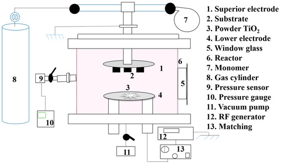 The plasma deposition process was performed in a capacitively coupled stainless steel reactor, as shown in Figure 1. A full description of this system can be found elsewhere [33], but it essentially consists of a stainless steel reactor, a vacuum system, and a generator.