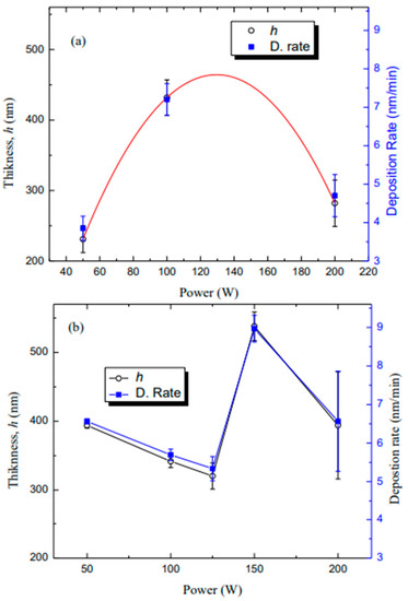 Considering the combined effect of P and TiO2 sputtering, the thickness decreased from 400 to 300 nm as P increased from 50 to 125 W. With further increasing P to 150 W promotes a sudden increase in h, but a new fall trend appears for the highest P level regime (>150 W) (Figure 2b). Since deposition time, t, was kept constant (60 min) in all the experiments, deposition rate (h/t) followed the same trend of thickness, ranging from 5.34 to 8.97 nm/min for a film deposition with TiO2 powder.