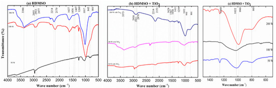 Infrared spectra of films deposited at different powers of, (a) HMDSO, (b) HMDSO with TiO2 sputtering, and (c) the same as (b), highlighting the low wavenumber 500–1500 cm−1 region.