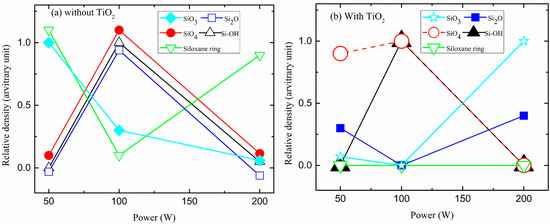 The Si-O stretching band was deconvoluted into several disparate peaks: 1123 ± 21, 1067 ± 17, 1016 ± 3, 995 ± 5, and 935 ± 1 cm−1, to see additional structural information upon the combined effect of P and TiO2, and the result is shown in Figure 4. The peak at 1123 ± 21 cm−1 is interpreted as a short-chain Si-O-Si, as a cage-type structure [61,62,63], where the Si atom is bonded to four O atoms at an angle of 150° [38,45]. Only the deposited film at 50 W, does not show this cage-type structure. The peak at 1067 ± 17 cm−1 is assonated to a long-chain Si-O-Si terminated with methyl or hydroxyl groups [61,63]. However, sometimes this area of the spectrum is viewed as only one peak of around 1050–1063 cm−1, which is then assigned to siloxane networks with Si-O-Si angles of ~144° [16,44]. It is the only structure that was shown in all deposited films. The peak at 1016 ± 3 cm−1 is ascribed to the siloxane ring (Si-O-Si in cyclotrisiloxanes) [61,62] and 995 ± 5 cm−1 is for Si suboxides (Si2O, Si bound with two oxygen atoms forming smaller Si-O-Si angles < 144) (62). Only the films deposited at 100 and 200 W did not show this structure. The peak at the lowest wavenumber, around ~935 cm−1, is usually referred to as the Si-OH silicon-hydroxyl stretching [64]. Only the deposited film at lower P does not show this silicon-hydroxyl structure. It was also confirmed that the absence of stretching and bending vibration of the O-H group in this P regime. An estimate of the trend in the density of these groups was obtained by the integrated absorption method [65] using the deconvolution components. In general, there is a tendency for the relative density of siloxane networks to decrease, and suboxides and stoichiometric oxide to increase, in a complementary way, confirming the conversion of one type of structure to another when increasing plasma excitation P.