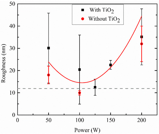 Figure 5 shows the average Ra roughness of HMDSO films as a function of P. The dashed line in this figure represents the value of the roughness of a clean glass surface exposed to the monomer without plasma ignition. Although the surface becomes rougher after the deposition takes place, with the rise of power until 125 W, it continuously decreased until reaching pure glass roughness. Afterwards, it increased again with a further increase in P. This is due to the creation of irregularities on the surface by the sputtering of deposited material and the incorporation of TiO2 particles, as observed in Figure 6. This significant effect of sputtering plasma also increases surface cracking in magnitude, which may be due to the incorporation of functionalities in the surface.