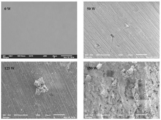 Figure 6 shows the scanning electron microscopy (SEI) micrographs of films deposited on aluminum substrates. As can be observed, the morphology of the aluminum surface was changed significantly upon film deposition, depending on plasma excitation P. Without sputtering, the smoothness and uniformity are increased with P until 100 W and, thereafter, one may observe small crystal-like particles. This is associated with the small thickness of the film deposited at a higher P. In addition to this, a film produced at 150 W shows aggregate incorporation of TiO2 spongy-shaped particles uniformly distributed on the whole evaluated part of the substrate. Particles are also observed in a small part of the surface on the film deposited at 125 W. This micrograph corroborates very well with previously reported Si-doped TiO2 nanocrystals and TiO2 nanoparticles synthesized by the sol-gel technique [58].