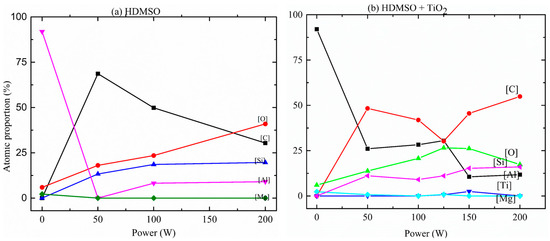 The atomic proportion of carbon, titanium, silicon, and oxygen in the films as a function of the plasma excitation power, (a) without TiO2 sputtering, (b) with TiO2 sputtering.