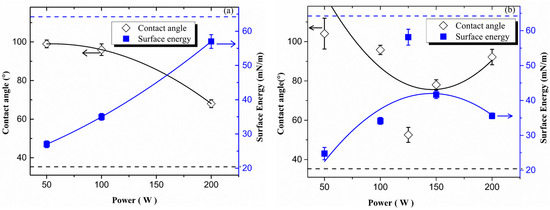 The contact angle and surface energy of the films derived from, (a) HMDSO and (b) HMDSO, with TiO2 plasmas as a function of plasma excitation power.