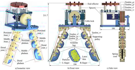 Three-dimensional design of the granular-tendon gripper: (a) isometric view, (b) front view, and (c) side view. The red-dashed line box and the green-dashed line box show the structure of the finger at each phalanx and at the entire finger. Moreover, the red solid lines visualize the tendon trajectories. The group of finger joints on the left finger (L-finger) include proximal joint , middle joint , and distal joint , whereas those on the right finger (R-finger) include the proximal joint , middle joint , and distal joint . The tendon and tendon are the respective grasping tendons on the L- and R-finger, whereas tendon and tendon , respectively, are the releasing tendon on the L- and R-finger.