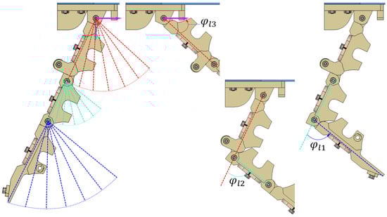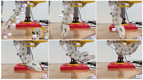 The morphology of the granular-tendon finger was determined using the coordinates , and or, equivalently, the rotational angles and (see Figure 4). These values were influenced by the rotational angle of the pulley , which was set to zero when the finger was completely straight and in its maximum released state. Increasing led to bending the finger inward. The values of and of the phalanx were obtained by image processing with their outcomes shown in Figure 5. and were zero at the maximum released state and reached 48.4° and 59.4° at = 100°, whereas those of were, respectively, 120 and 56.3°. and increased, respectively, by 0.5 and 0.6°, and decreased by 0.6° for each degree deviation of . The reduction in followed a nearly linear trend, whereas the increments in and were not consistent. In particular, exhibited a rapid increment trend in the range of = [20, 40]° while showed a similar trend in the range of = [0, 20]°.