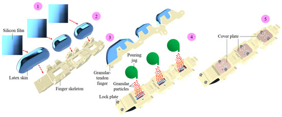 Step-by-step fabrication process for a granular-tendon finger. (1) Step 1: Prepare the latex skins. (2) Step 2: Generate the shape for the latex skin. (3) Step 3: Print the rigid skeleton and mount the granular bags over it. (4) Step 4: Pour the granular particles into the granular bags. (5) Step 5: Attach the cover plates to the phalanx for sealing the granular bags.