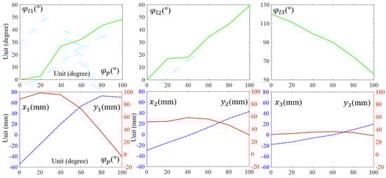 Coordinates x and y of each phalanx varied according to the variation in . As shown in Figure 5, increased from −54.4 to 72.8 mm and then slightly reduced to 70.1 mm in the range of = [0, 80]° and [80, 100]°. Concurrently, reached the maximum value of 98.5 mm at = 20°. had a roughly linear increment with the (min, max) values, respectively, (−29.6, 42.7) and (−17.8, 20.1) at = (0, 100)°. reached the maximum value 58.3 mm at = 40°, whereas the maximum value of was 36.7 mm at = 60°. The coordinate deviations in the phalanxes reduced from the distal to proximal; that of was smaller compared to that of .