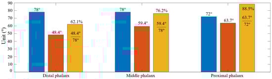 Influence of granular bag on the reduced rotational angle on each phalanx after assembly. At each group, the blue and yellow columns, respectively, illustrate the maximum angle of , and before and after mounting the granular bags on the skeleton. The orange column shows the percentage ratio between the two previous columns at .