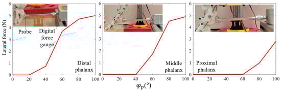 The test outcomes revealed that there was hysteresis between (the rotational angle of the driving pulley) and the lateral force exerted by the finger in the three phalanges. In the case of the distal phalanx, the lateral force remained constant when increased to 20°, whereas, in the case of the middle and proximal phalanxes, the variation in lateral force appeared at = 40° and 60°, respectively. The lateral force gradually increased after each 20° deviation except for a sudden jump between 40 and 60°. The middle phalanx exhibited a rapid increment in lateral force when was between 40° and 80°, followed by a slight increase until maximum . The lateral force in the case of the proximal phalanx jumped from zero to 2.8 N in the range of = [60, 100]°. The maximum lateral force measured in this design was generated by the distal phalanx with a value of 5 N, whereas, the middle phalanx created 97.8% lateral force generated by the distal case.