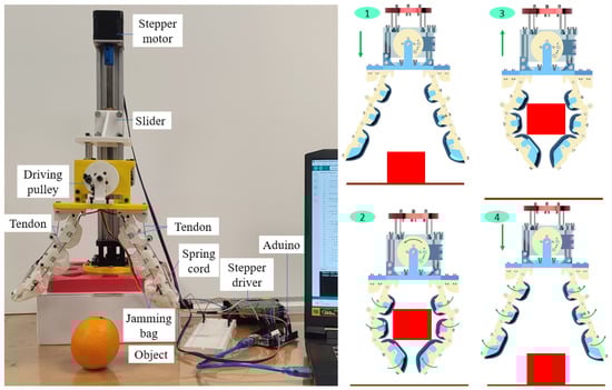 Experimental setup for evaluating the grasping performance of the granular-tendon gripper. The grasping process included four minor sequential steps: (1) approach, (2) grasp, (3) lift, and (4) release.