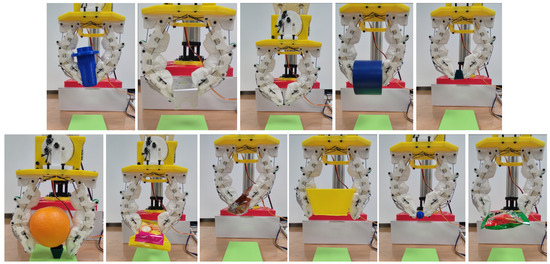Figure 9 demonstrates the grasping performance of the granular-tendon gripper with successful trials. The specific contact point between the gripper and the objects varied depending on their size. For light and small objects such as the bolt, pyramid, cake, coffee sachet, sphere, and drink sachet, the gripper used its fingertips to grip them. The granular bag of the distal phalanx was deformed to enhance the contact area with the objects, while the main grasping force was generated by the fingertips. The U-shaped bracket and tape were held by the distal phalanx with contact at that point. The cylinder and orange contacted with the fingers at both the distal phalanx and the middle phalanx on the L-finger. In this scenario, the grasping force was primarily exerted by the distal phalanx, while the middle phalanx enhanced the stability of the grasped objects. The big pyramid contacted both the middle phalanx and distal phalanx and received grasping force from both. As shown in Figure 10, the gripper could pick and lift all objects except for the flat plate. In this scenario, all objects contacted the finger at the distal phalanx with completely flat–flat contact interfaces.