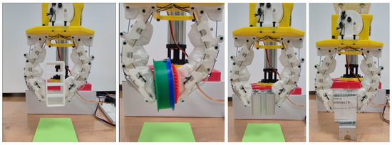 Initially, the gripper was located such that the fingertips were positioned 10 mm above the floor and the fingers fully opened in the maximum state (with the straight phalanxes). The objects (15 different samples) were positioned on the floor: cylinder, U-shaped bracket, M3 bolt, tape, pyramid, big pyramid, orange, cake, coffee sachet, sphere, drink sachet, shelf, pulley gear, aluminium profile, and flat bracket (see Table 1). The fingers of the gripper then closed together to grasp the object on the floor. The gripper held and lifted the object to a height of 75 mm from the floor. Finally, the gripper moved back to its original position and released the object onto the floor. Each sample was tested five times before moving to the next sample.
