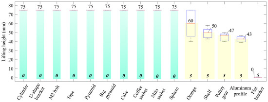 Based on the results shown in Figure 11, when picking up the cylinder, U-shaped bracket, M3 bolt, tape, pyramid, big pyramid, cake, coffee sachet, drink sachet, and sphere, the gripper achieved a lifting height of 75 mm. Figure 11 also indicated the mean and deviation values of the grasped object samples that could not be lifted to the full height. In this situation, the gripper could not lift the flat bracket away from the floor. The mean value of all trials in this showcase was zero. The range of the lifting height for the case of grasping orange, shelf, pulley gear, and aluminium profile interfered. The mean values of lifting height for such cases were, respectively, 60, 50, 46.8, and 42.9 mm. While the mean value of grasping the orange was higher compared to the others, it also had the lowest minimum value and reached a maximum value of 75 mm. As shown in Figure 11, if one trial reached the full lifting height, we counted it as one successful case, and a failure case otherwise. In this scenario, grasping the shelf, pulley gear, aluminium profile, and flat bracket completely failed. Grasping the orange achieved two successful trials, whereas the remaining cases had zero failure cases.