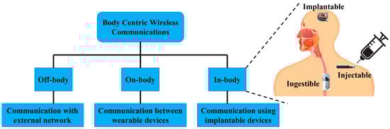 Body-centric communication system (BWCS) is an emerging technology referring to human self and human-to-human networking, which uses implantable and wearable sensors [1]. BWCS is a combined field of wireless body area networks (WBANs), wireless personal area networks (WPANs) and wireless sensor networks (WSNs). It is also classified as off-body, on-body and in-body communication, as shown in Figure 1. On-body communication is the communication between different wearable devices. The communication between an outside and an on-body device is designated as off-body communication [2]. In-body communication system means the communication of implantable devices and sensors inside the body with an external device or communication with another implant. In-body biomedical devices (IBBDs) are designed to monitor physiological data inside the human body and provide key support to improve the quality of life through disease prevention, therapy and diagnosis, such as drug delivery system, neurostimulators, bone growth stimulators, and treatment of numerous severe conditions in the medical profession [3]. Wireless IBBDs are divided into implantables, ingestibles and injectables based on the way they are inserted into the human body [4]. Specifically, implantable devices are the most common type of IBBDs sited inside the human body through a surgical operation [5]. In the last decade, implants have advanced from bulky pacemakers to micro-sized deep brain implants [6]. Ingestible devices are generally capsule-shaped devices, which are ingested and swallowed, similar to regular pills [7]. The most conventional ingestible device is the wireless endoscopic capsule, which was originally discovered in the year 2000 [8]. Currently, wireless ingestible capsules are equipped with cutting-edge abilities, which can also monitor the side effects of pharmaceuticals [9].