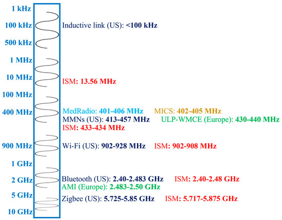 Figure 2 shows different frequency bands allocated for in-body antennas. The choice of an operation frequency for IBBDs involves several trade-offs. Generally, lower frequencies are attractive and commonly used, as they facilitate lower loss of the biological tissue medium, which can lead to higher efficiency and better tissue safety. However, lower frequencies have the drawback of limiting the communication speed and requiring larger antenna size. In contrast, higher frequency bands provide high data rates and miniaturization at the cost of lower tissue safety. In Figure 2, frequencies below 100 kHz are allocated for short-range inductive IBBDs by the Federal Communication Commission (FCC) in the United States (US) for lower power and data transmission [21]. Medical micropower networks (MMNs) are another FCC-approved short-range frequency band with a 24 MHz spectrum from 413 to 457 MHz. Furthermore, Wi-Fi (902–928 MHz), Bluetooth (2.40–2.483 GHz) and Zigbee (5.725–5.850 GHz) are designated for short-range digital modulation communication for IBBDs by the FCC in the US.