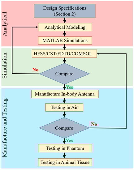 Figure 4 shows the generalized steps for designing, manufacturing and testing in-body antennas. In the first step, the researchers benchmark the antenna parameters based on the specifications provided in Section 2. These parameters are then used to generate an analytical model, which leads to analysis and simulation in programming and numeric computing platforms, such as MATLAB [44,59,60,61,62,63,64]. This is an important step of optimizing the antenna to accomplish the best performance [65].