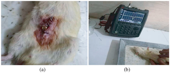 In vitro study is commonly carried out in an artificial biological environment, which cannot confirm the stability of the implanted antenna system because of the lack of dynamic illustration of a real biological environment in the in vitro study [51]. Therefore, the testing of in-body antenna in a real biological environment (in vivo) is commonly suggested after in vitro testing. Before implantation of the in-body antenna prototype inside the biological body, it is necessary to ensure that the temperature of the testing environment is below 100 °C. Generally, the in-body antenna itself generates heat up to 60 °C because of the battery and other internal system devices. Furthermore, the in-body antenna must be insulated by using biocompatible material to protect the antenna system from coupling loss, as described in Section 2.5. Figure 7 and Figure 8 [23,77] illustrate the in vivo testing of the glucose monitoring implantable antenna in a rat and monitoring of blood pressure of the left ventricle, respectively.