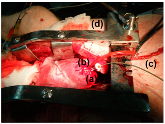 Anesthetized mixed landrace pig with (a) exposed left ventricular (LV) apex, (b) implanted wireless pressure sensor, (c) catheter-tip transducer and (d) chest spreader [23]. Reproduced with permission from an open-access article from Biomedical Microdevices (CC-BY).