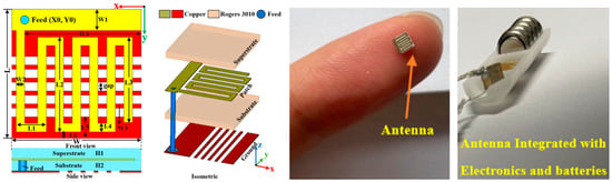 - Islam, S.M.; Esselle, K.P.; Bull, D.; Pilowsky, P.M. Bandwidth enhancement of an implantable RFID tag antenna at 900 MHz ISM band for RF telemetry. In Proceedings of the 2012 International Symposium on Communications and Information Technologies, Gold Coast, Australia, 2–5 October 2012; pp. 741–745. [Google Scholar] [CrossRef]