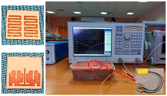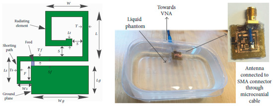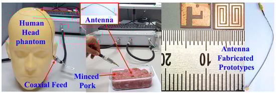 The manufactured in-body antenna is verified in the in vitro antenna testing procedure using an artificially built biological environment or phantom [65]. The biological tissue properties (relative permittivity and electrical conductance) of different parts of the body at different operating frequencies are provided in the Foundation for Research on Information Technologies in Society (IT’IS) website, which was established through the resourcefulness and support of the Swiss Federal Institute of Technology (ETH) in Zurich [71]. Before preparing the phantom of a particular body part, it is necessary to know its permittivity and electrical conductance at the in-body antenna operation frequency. Low-frequency band liquid phantom, as shown in Figure 5, is investigated in Refs. [70,72], where purified water, polyethylene powder and NaCl are used as the main material, relative permittivity and conductivity generation material, respectively. Several works presented the investigation of the phantom in the ISM and MICS bands [13,28,73,74]. In Ref. [13], a gel type phantom imitating the properties of muscle tissue is built with hydrophilic organic powder and degassed water, as shown in Figure 6.
