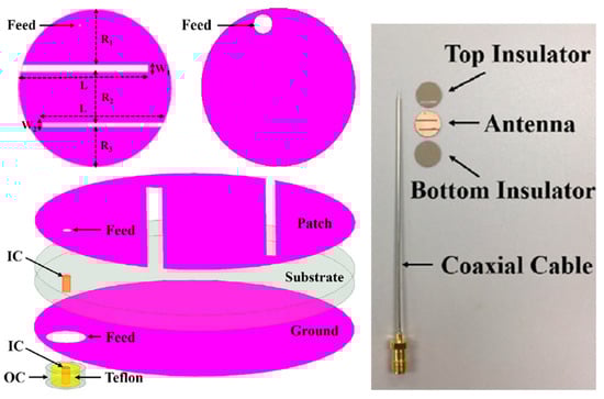 Detailed methodology of the manufacturing process of an in-body patch-type planar antenna has been outlined in Ref. [65]. In antenna manufacturing, a photolithography mask is first produced to confirm the antenna geometry, including antenna layers, which are going to be stacked on the plane. In the next step, the antenna layers are etched according to the antenna geometry using the photolithography mask. Furthermore, the lower substrate comprises the ground and lower patch; the upper substrate comprises the upper patch; and the superstrate is positioned on the top. Additionally, a circular-shaped hole is etched as per the patch geometry, where four pins are located at the base of the mask. Afterward, all the layers are machined to the circular format, and the layers of the antenna are positioned in a straight line.