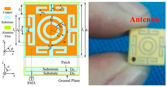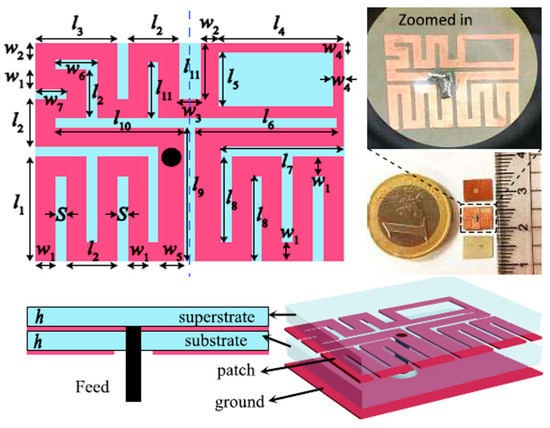 High permittivity substrate/superstrate material can shift the antenna resonant frequency near to the lower frequency band, which shortens the operation wavelength [2]. This simple technique can provide a higher degree of miniaturization. Some of the materials, which are generally used as a dielectric substrate for in-body antennas, include alumina ceramic (relative permittivity, εr = 9.4) [26,27] and Rogers 3210 [28], 3010 [29], 6002 [30] with εr = 10.2. A substantial reduction in effective antenna length is realized by using MgTa1.5Nb0.5O6 as a dielectric substrate, with the dielectric constant εr = 28 [31]. However, this method results in a significant level of surface wave excitation within the substrate. This results in lower bandwidth and a decrease in overall radiation efficiency [32]. The higher cost of these materials is another issue.