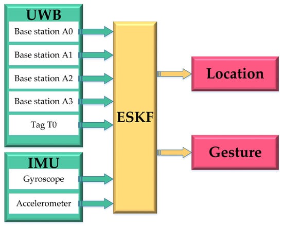 where X is the state quantity we want to estimate. For IMU-assisted UWB data fusion localization systems, there are various options for the estimation of the state. In this article, the displacement error, velocity error, attitude error, bias error of the gyroscope, and bias error of the accelerometer are selected and written as vectors as follows:
