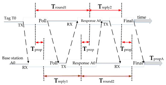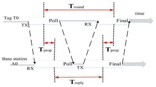 As shown in Figure 2, the tag T0 sends a Poll to base station A0. Upon receiving the Poll, base station A0 responds with an R. The process ends when tag T0 receives the R. is the time it takes for tag T0 to send a message and receive a response. is the time it takes for base station A0 to receive the Poll and send an R in response. The time required for tag T0 to reach base station A0 is: