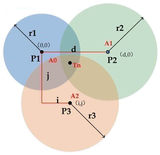 Using a trilateral ranging positioning method in the same reference coordinate system, where the coordinate values of all base stations are known, the UWB positioning system deploys N base stations in the mining area. Figure 4 shows the schematic diagram of the classical trilateral ranging method for UWB positioning. Record the coordinate values of the i base station as () (i = 1, 2, ⋯, n). Let the coordinate distance value of the unknown point label to the ith base station be (i = 1, 2, ⋯, n). Drawing a circle with , , ⋯, as the radius among them, the focal point, and the position of the unknown point are calculated according to the Pythagorean theorem as follows: