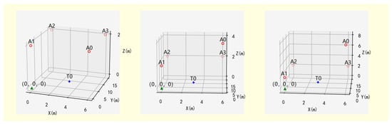Where denotes the singular value vector of the matrix M for SVD decomposition. denotes the volume of the polyhedron with the base station as the vertex. indicates the space constraint. If the base stations are mostly installed in areas such as walls and corners, λ is a weighting parameter indicating the trade-off between spatial coverage volume and positioning performance of the positioning system. In this work, the IMU-assisted UWB positioning system is modeled and simulated to compare the impact of the base station on the positioning accuracy of the system under different layouts. The simulated scenario changes the height of the base station A0 node to produce three different spatial layouts, as shown in Figure 6. The red dots represent base stations, and the blue triangles represent tags.