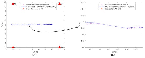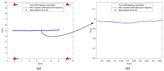UWB positioning errors are stable over long periods, while inertial navigation positioning errors are accurate over short periods. A single navigation system cannot achieve precise positioning and navigation, and there are features such as complementary advantages between different positioning systems. The combined positioning model effectively addresses NLOS interference or occlusion in GPS denial scenarios. When there are NLOS errors at the base station, the combined positioning model switches the positioning solution to the inertial navigation system in time and then switches back to the combined model when the NLOS interference disappears. The combined positioning system, therefore, has the advantages of high accuracy, stability, and adaptability to the environment. Figure 11 indicates that the UWB data is lost, and the IMU can work continuously. Where Figure 11b shows a partially enlarged view of Figure 11a.