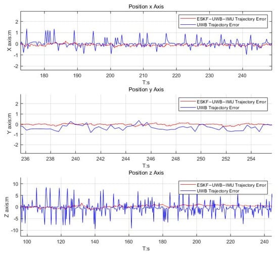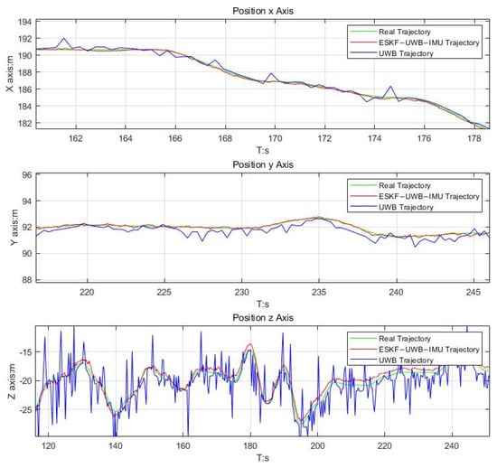 As shown in Figure 13, the green line indicates the real trajectory. The blue line indicates the trajectory of the UWB positioning system. The red line indicates the trajectory using the ESKF to fuse the data from both IMU and UWB sensors. They are plotted at each output position trajectory. As can be seen in Figure 13, the trajectory on the XYZ axis from the fusion of the two sensor data, IMU and UWB, using the ESKF fits better with the real trajectory. Whereas the trajectory of the UWB positioning system has a greater impact on the trajectory on the XY axis, the trajectory on the Z axis has a greater trajectory error due to the low spatial resolution.