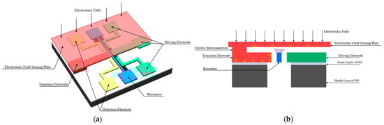 A schematic view of the proposed electrostatic field sensor. (a) A 3D schematic view of the proposed electrostatic field sensor; (b) a cross-section schematic view of the proposed electrostatic field sensor.